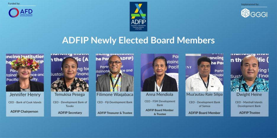 The newly elected ADFIP Board includes Jennifer Henry, Chairperson and CEO of the Bank of Cook Islands; Temukisa Pesega, Secretary and CEO of the Development Bank of Tuvalu; Filimone Waqabaca, Treasurer and CEO of the Fiji Development Bank and Trustee of the ADFIP Trust; Anna Mendiola, Board Member and CEO of FSM Development Bank and Trustee of the ADFIP Trust; and Muā’autau Raie Silipa, Board Member and CEO of the Development Bank of Samoa. Dwight Heine of the Marshall Islands Development Bank also joins the ADFIP Trust as a Trustee.